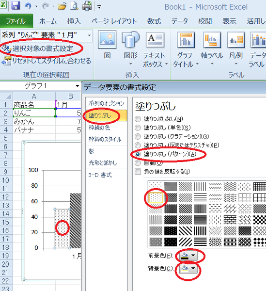 エクセルで、棒グラフを作成し、棒を点線や斜線で区別して、見やすく - excel グラフ 背景 塗りつぶし